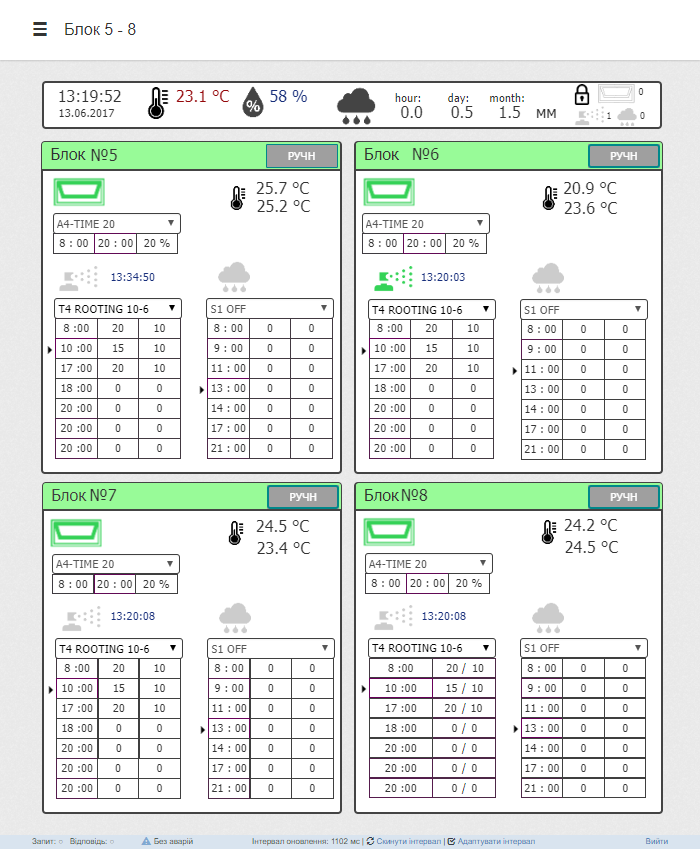 In jedem der Gewächshäuser mussten Temperatur, Luftfeuchtigkeit, Bewässerungsventile, Nebel, Actuator der Oberflügel gesteuert und die Parameter in den Diagrammen aufgezeichnet werden. Für jeden der Stellantriebe war es erforderlich, den Zeitplan festzulegen und die Programme, sowie die Möglichkeit zu verwenden, die Position der Oberflügel durch die Temperatur zu steuern.